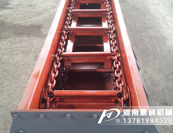 刮板輸送機(jī)的工作原理是,將敞開的溜槽,作為煤炭、矸石或物料等的承受件,將刮板固定在鏈條上(組成刮板鏈),作為牽引構(gòu)件。當(dāng)機(jī)頭傳動(dòng)部啟動(dòng)后,帶動(dòng)機(jī)頭軸上的鏈輪旋轉(zhuǎn),使刮板鏈循環(huán)運(yùn)行帶動(dòng)物料沿著溜槽移動(dòng),直至到機(jī)頭部卸載。刮板鏈繞過(guò)鏈輪作無(wú)級(jí)閉合循環(huán)運(yùn)行,完成物料的輸送。